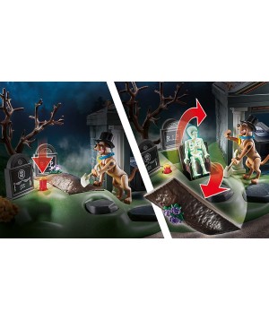 Diviértete en la Aventura en el Cementerio de Scooby Doo de Playmobil; un ataúd mágico que hace desaparecer figuras y cosas, y muchas otras sorpresas fantasmales esperan a los amigos en el cementerio; el espíritu contenido puede ser desenmascarado