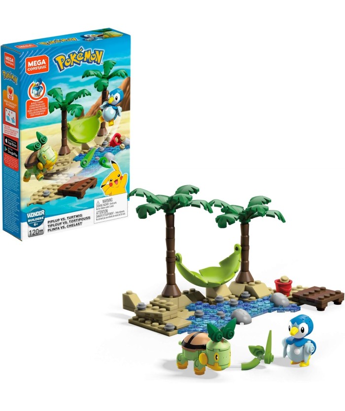 ¡Organiza una fiesta en la playa cuando Piplup y Turtwig se enfrenten! ¡Elige tu Pokémon y lucha para convertirte en el mejor! Es Piplup vs. ¡Turtwig cuando creas tu propio Pokémon lleno de acción entre estos dos Pokémon opuestos! ¡Construye tu Pokémon, prepara el escenario para una batalla y luego lanza un travieso ataque con Turtwig para sacar a Piplup de su hamaca y tirarlo directamente al agua! Ideal para mayores de 6 años