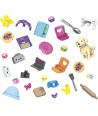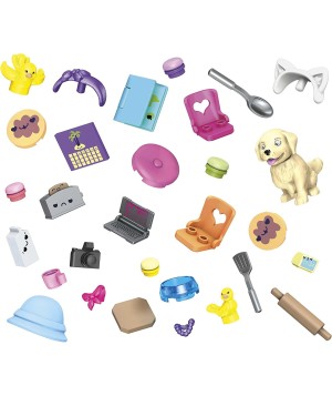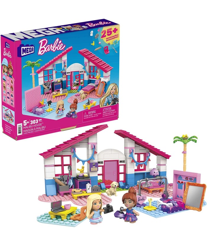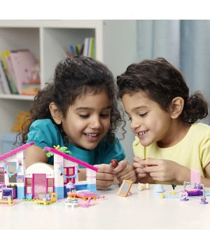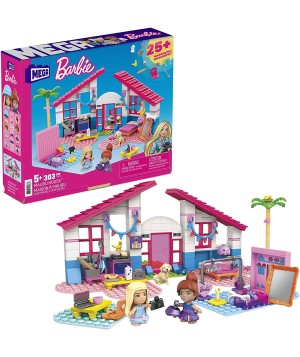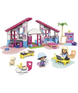 El set de construcción incluye 2 micromuñecas Barbie, 1 perrito, 2 pájaros, 303 bloques de construcción con piezas y accesorios especiales y 5 placas de apoyo con forma de corazón para construir sobre ella