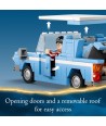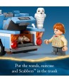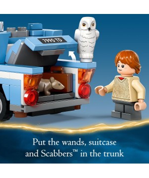 Ford Anglia de juguete: Cuenta con puertas que se abren, techo removible, asientos para las 2 minifiguras y espacio en la parte de atrás para Hedwig, además de una cajuela abatible en la que caben las varitas, la maleta y Scabbers