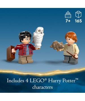 Set de aventuras con 4 personajes LEGO Harry Potter: Minifiguras de Harry Potter y Ron Weasley, figuras de Hedwig y Scabbers, y elementos que representan una maleta y 2 varitas