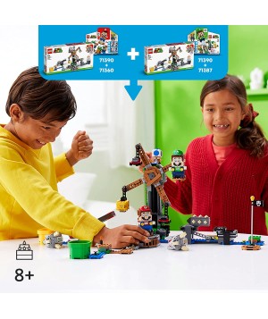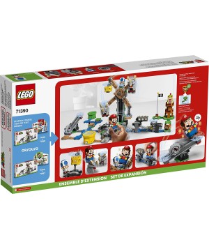 Haz que el universo LEGO Super MarioTM sea extra emocionante para los niños con este Set de Expansión de Reznor Knockdown (71390). Cuenta con plataformas giratorias edificables que giran al girar LEGO- MarioTM y/o LEGO- LuigiTM (figuras no incluidas) en el soporte conectado. Utilice el Skewer para derribar las 2 figuras de Reznor de las plataformas giratorias y rescatar el Sapo Azul de la parte superior. El conjunto también incluye un Sesawing Grrrol, ? Bloque y una tubería especial: Velocidad Corre para desafíos de velocidad. (Nota: el curso de inicio 71360 o 71387 es necesario para jugar.)
