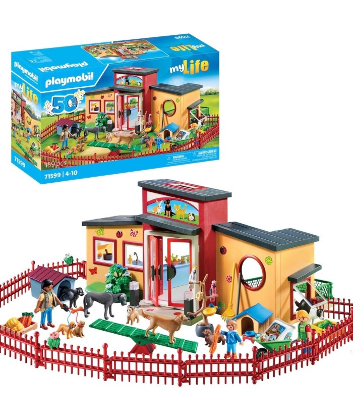 Diversión en el exclusivo hotel para mascotas, ¡celebrando el aniversario de PLAYMOBIL! ¡Únete a la fiesta! ¡PLAYMOBIL cumple 50 años y es hora de celebrarlo! En 1974, un obrero de la construcción, un caballero y un nativo americano hicieron su debut, capturando los corazones de los niños de todo el mundo. Durante 50 años, estas sonrientes figuras de juguete han inspirado a los niños a crear sus propias historias, asumir diversos papeles y embarcarse en un sinfín de aventuras en el reino de la imaginación. Ahora, con motivo de su cumpleaños, el querido Hotel de mascotas vuelve en una reedición exclusiva. En este hotel todo gira en torno a la diversión. Los peludos residentes reciben cariño y atención. Los amigos pueden retozar y jugar a sus anchas en el jardín a través de la puerta para
