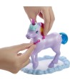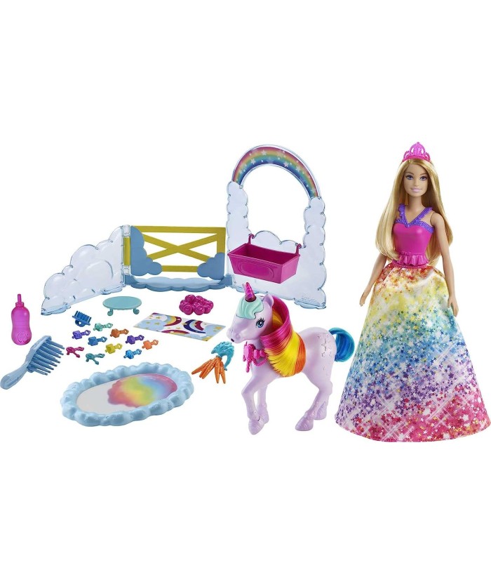 Las niñas pueden jugar a alimentar, cuidar y hacer peinados divertidos mientras ayudan a la muñeca princesa Barbie a cuidar a su mágico unicornio en su establo inspirado en las nubes.