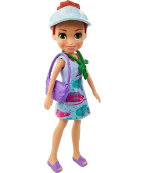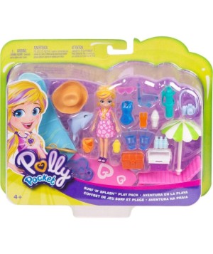 El Paquete Aventura de Surf incluye la muñeca Polly de 7 cm y accesorios de agua, tierra y moda que incluyen: tabla de windsurf (los pies de la muñeca Polly encajan en las ranuras de la tabla de windsurf), chaleco salvavidas, esnórquel/máscara, tanque, aletas, cofre del tesoro, amigo delfín, silla de playa con