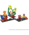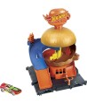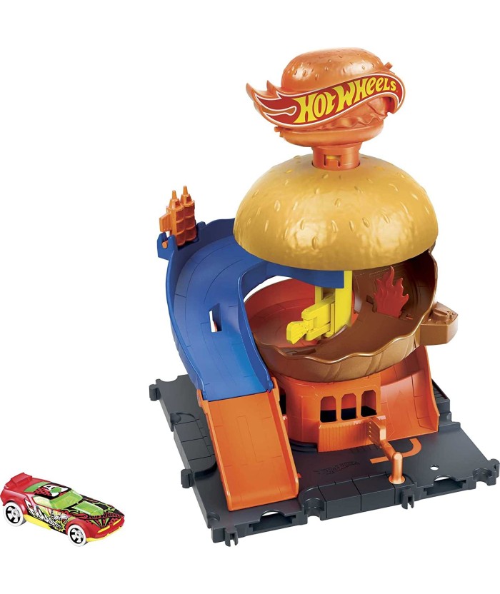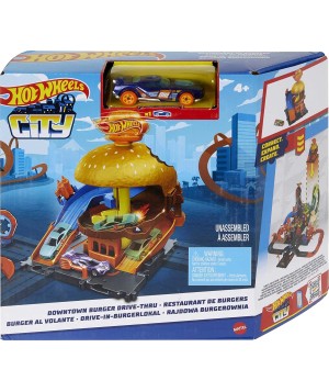 Cuando luches contra las criaturas de Hot Wheels City, realiza una parada en Hot Wheels City Downtown Burger Drive-Thru para disfrutar algo de comida. ¡Pero ten cuidado con los peligrosos enemigos que le han dado un bocado a la hamburguesa!