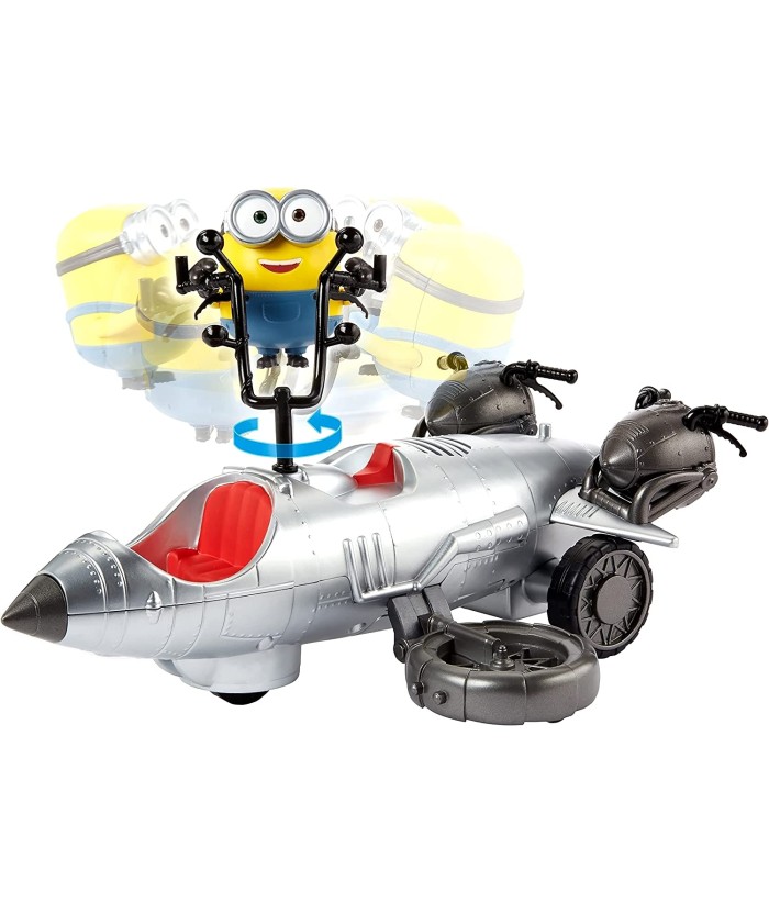 ¡Da un paseo salvaje con Bob en este auténtico Minions: The Rise of Gru RC! En la película, el joven maestro Gru rompe el cielo y las calles en este elegante vehículo techno. Recrea las emociones con The Wild Rider ™ RC, su controlador fácil de usar y su querido Minion Bob. Bob agarra el manillar listo para un emocionante viaje. Acelera el RC a través del piso con maniobrabilidad de giro en J. A medida que aumenta la velocidad, Bob reacciona y vuela sobre el manillar y da una vuelta completa de 360 ??grados en el aire. El motor auténtico suena a revoluciones y Bob emite más de 15 Minions para mejorar la diversión. También puede mover a Bob a diferentes asientos en la bicicleta, o adjuntar hasta cuatro figuras a escala de 4 pulgadas a la bicicleta para una carga completa. Siéntese uno en el